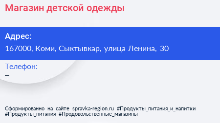 Магазин детской одежды по адресу 167000, Коми, Сыктывкар, улица Ленина, 30 в дальнейшем Организация, размещена в следующих категориях: