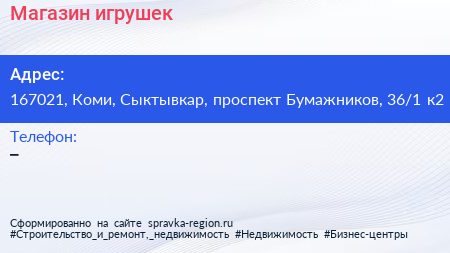 Магазин игрушек по адресу 167021, Коми, Сыктывкар, проспект Бумажников, 36/1 к2 в дальнейшем Организация, размещена в следующих категориях: