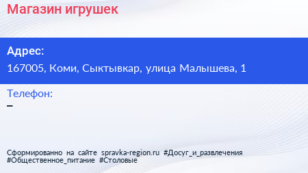 Магазин игрушек по адресу 167005, Коми, Сыктывкар, улица Малышева, 1 в дальнейшем Организация, размещена в следующих категориях: