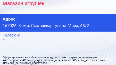 Магазин игрушек по адресу 167026, Коми, Сыктывкар, улица Мира, 68/2 в дальнейшем Организация, размещена в следующих категориях: