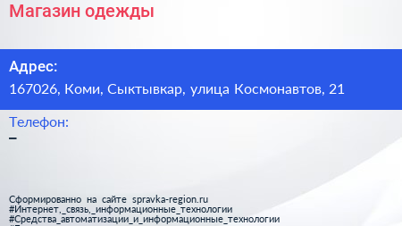 Магазин одежды по адресу 167026, Коми, Сыктывкар, улица Космонавтов, 21 в дальнейшем Организация, размещена в следующих категориях: