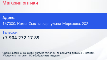 Магазин оптики по адресу 167000, Коми, Сыктывкар, улица Морозова, 202 в дальнейшем Организация, размещена в следующих категориях: