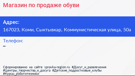 Магазин по продаже обуви по адресу 167023, Коми, Сыктывкар, Коммунистическая улица, 50а в дальнейшем Организация, размещена в следующих категориях: