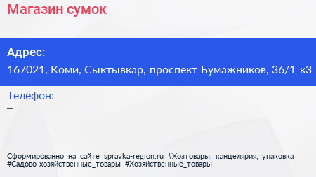 Магазин сумок по адресу 167021, Коми, Сыктывкар, проспект Бумажников, 36/1 к3 в дальнейшем Организация, размещена в следующих категориях: