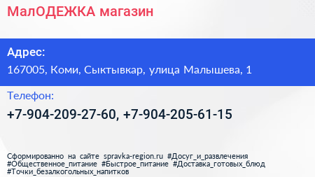 МалОДЕЖКА, магазин по адресу 167005, Коми, Сыктывкар, улица Малышева, 1 в дальнейшем Организация, размещена в следующих категориях: