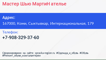 Мастер Шью МартиН, ателье по адресу 167000, Коми, Сыктывкар, Интернациональная, 179 в дальнейшем Организация, размещена в следующих категориях: