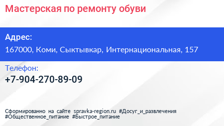 Мастерская по ремонту обуви по адресу 167000, Коми, Сыктывкар, Интернациональная, 157 в дальнейшем Организация, размещена в следующих категориях: