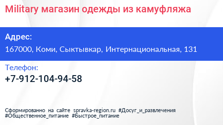 Military, магазин одежды из камуфляжа по адресу 167000, Коми, Сыктывкар, Интернациональная, 131 в дальнейшем Организация, размещена в следующих категориях: