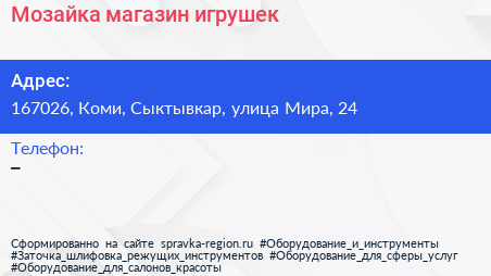 Мозайка, магазин игрушек по адресу 167026, Коми, Сыктывкар, улица Мира, 24 в дальнейшем Организация, размещена в следующих категориях: