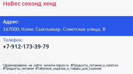 НаВес, секонд-хенд по адресу 167000, Коми, Сыктывкар, Советская улица, 8 в дальнейшем Организация, размещена в следующих категориях: