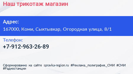 Наш трикотаж, магазин по адресу 167000, Коми, Сыктывкар, Огородная улица, 8/1 в дальнейшем Организация, размещена в следующих категориях: