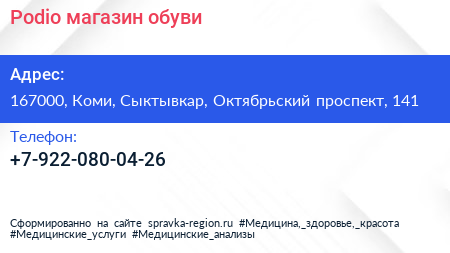 Podio, магазин обуви по адресу 167000, Коми, Сыктывкар, Октябрьский проспект, 141 в дальнейшем Организация, размещена в следующих категориях: