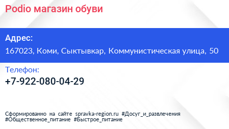 Podio, магазин обуви по адресу 167023, Коми, Сыктывкар, Коммунистическая улица, 50 в дальнейшем Организация, размещена в следующих категориях: