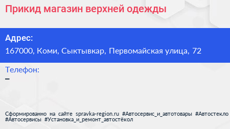 Прикид, магазин верхней одежды по адресу 167000, Коми, Сыктывкар, Первомайская улица, 72 в дальнейшем Организация, размещена в следующих категориях: