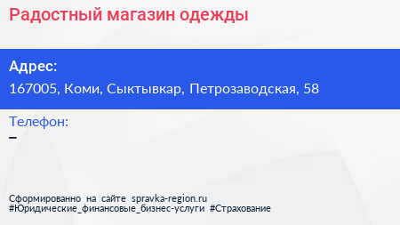 Радостный, магазин одежды по адресу 167005, Коми, Сыктывкар, Петрозаводская, 58 в дальнейшем Организация, размещена в следующих категориях: