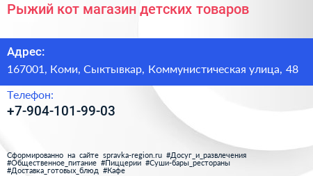Рыжий кот, магазин детских товаров по адресу 167001, Коми, Сыктывкар, Коммунистическая улица, 48 в дальнейшем Организация, размещена в следующих категориях:
