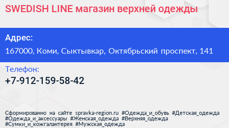 SWEDISH LINE, магазин верхней одежды по адресу 167000, Коми, Сыктывкар, Октябрьский проспект, 141 в дальнейшем Организация, размещена в следующих категориях:
