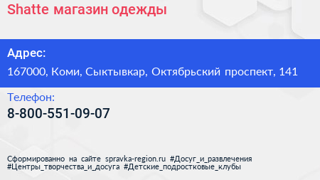 Shatte, магазин одежды по адресу 167000, Коми, Сыктывкар, Октябрьский проспект, 141 в дальнейшем Организация, размещена в следующих категориях: