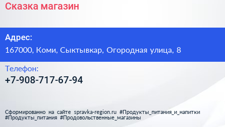 Сказка, магазин по адресу 167000, Коми, Сыктывкар, Огородная улица, 8 в дальнейшем Организация, размещена в следующих категориях: