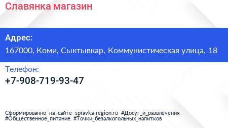 Славянка, магазин по адресу 167000, Коми, Сыктывкар, Коммунистическая улица, 18 в дальнейшем Организация, размещена в следующих категориях: