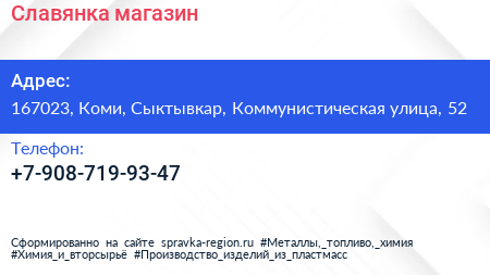 Славянка, магазин по адресу 167023, Коми, Сыктывкар, Коммунистическая улица, 52 в дальнейшем Организация, размещена в следующих категориях: