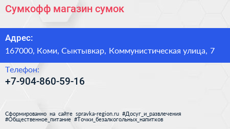 Сумкофф, магазин сумок по адресу 167000, Коми, Сыктывкар, Коммунистическая улица, 7 в дальнейшем Организация, размещена в следующих категориях: