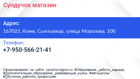Сундучок, магазин по адресу 167023, Коми, Сыктывкар, улица Морозова, 100 в дальнейшем Организация, размещена в следующих категориях: