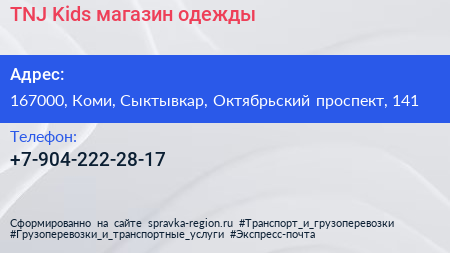 TNJ Kids, магазин одежды по адресу 167000, Коми, Сыктывкар, Октябрьский проспект, 141 в дальнейшем Организация, размещена в следующих категориях: