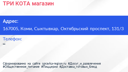ТРИ КОТА, магазин по адресу 167005, Коми, Сыктывкар, Октябрьский проспект, 131/3 в дальнейшем Организация, размещена в следующих категориях: