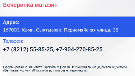 Вечеринка, магазин по адресу 167000, Коми, Сыктывкар, Первомайская улица, 38 в дальнейшем Организация, размещена в следующих категориях: