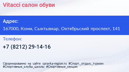 Vitacci, салон обуви по адресу 167000, Коми, Сыктывкар, Октябрьский проспект, 141 в дальнейшем Организация, размещена в следующих категориях: