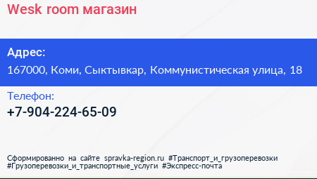 Wesk room, магазин по адресу 167000, Коми, Сыктывкар, Коммунистическая улица, 18 в дальнейшем Организация, размещена в следующих категориях: