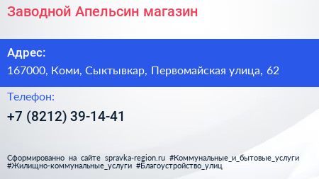 Заводной Апельсин, магазин по адресу 167000, Коми, Сыктывкар, Первомайская улица, 62 в дальнейшем Организация, размещена в следующих категориях: