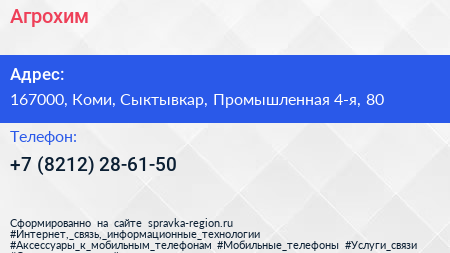 Агрохим по адресу 167000, Коми, Сыктывкар, Промышленная 4-я, 80 в дальнейшем Организация, размещена в следующих категориях:
