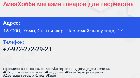 АйваХобби, магазин товаров для творчества по адресу 167000, Коми, Сыктывкар, Первомайская улица, 47 в дальнейшем Организация, размещена в следующих категориях: