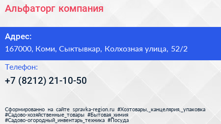 Альфаторг, компания по адресу 167000, Коми, Сыктывкар, Колхозная улица, 52/2 в дальнейшем Организация, размещена в следующих категориях: