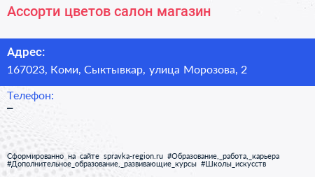 Ассорти цветов, салон-магазин по адресу 167023, Коми, Сыктывкар, улица Морозова, 2 в дальнейшем Организация, размещена в следующих категориях: