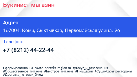 Букинист, магазин по адресу 167004, Коми, Сыктывкар, Первомайская улица, 96 в дальнейшем Организация, размещена в следующих категориях: