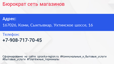 Бюрократ, сеть магазинов по адресу 167026, Коми, Сыктывкар, Ухтинское шоссе, 16 в дальнейшем Организация, размещена в следующих категориях: