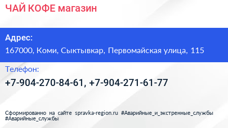 ЧАЙ & КОФЕ, магазин по адресу 167000, Коми, Сыктывкар, Первомайская улица, 115 в дальнейшем Организация, размещена в следующих категориях: