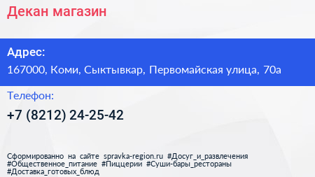 Декан, магазин по адресу 167000, Коми, Сыктывкар, Первомайская улица, 70а в дальнейшем Организация, размещена в следующих категориях: