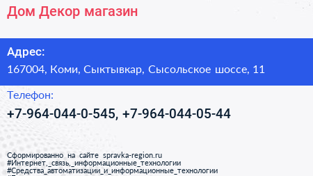 Дом & Декор, магазин по адресу 167004, Коми, Сыктывкар, Сысольское шоссе, 11 в дальнейшем Организация, размещена в следующих категориях: