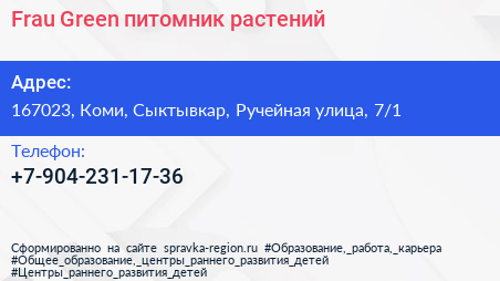 Frau Green, питомник растений по адресу 167023, Коми, Сыктывкар, Ручейная улица, 7/1 в дальнейшем Организация, размещена в следующих категориях: