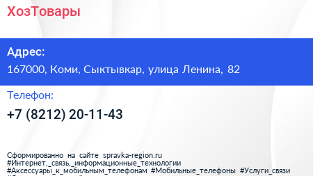 ХозТовары по адресу 167000, Коми, Сыктывкар, улица Ленина, 82 в дальнейшем Организация, размещена в следующих категориях: