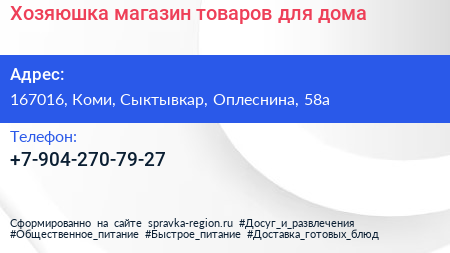 Хозяюшка, магазин товаров для дома по адресу 167016, Коми, Сыктывкар, Оплеснина, 58а в дальнейшем Организация, размещена в следующих категориях: