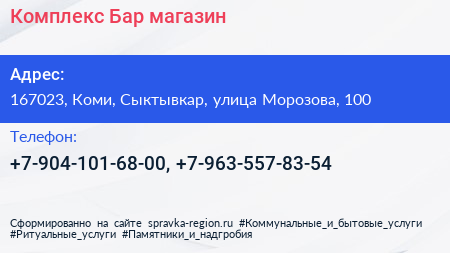 Комплекс-Бар, магазин по адресу 167023, Коми, Сыктывкар, улица Морозова, 100 в дальнейшем Организация, размещена в следующих категориях: