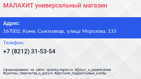 МАЛАХИТ, универсальный магазин по адресу 167002, Коми, Сыктывкар, улица Морозова, 133 в дальнейшем Организация, размещена в следующих категориях: