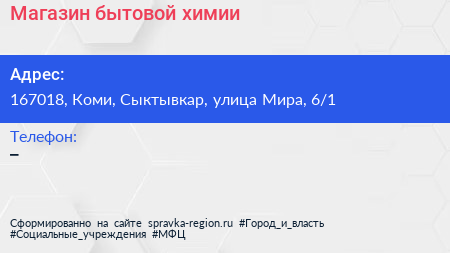 Магазин бытовой химии по адресу 167018, Коми, Сыктывкар, улица Мира, 6/1 в дальнейшем Организация, размещена в следующих категориях: