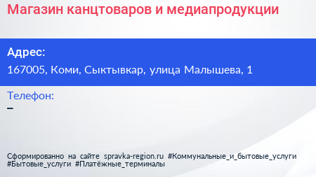 Магазин канцтоваров и медиапродукции по адресу 167005, Коми, Сыктывкар, улица Малышева, 1 в дальнейшем Организация, размещена в следующих категориях: