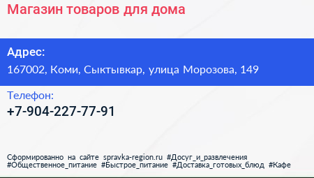 Магазин товаров для дома по адресу 167002, Коми, Сыктывкар, улица Морозова, 149 в дальнейшем Организация, размещена в следующих категориях: